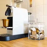 Dit appartement biedt gasten de handige voorziening van een droger, toiletartikelen en handdoeken in de badkamer. Er is ook een apart toilet, een douche en een wasmachine.